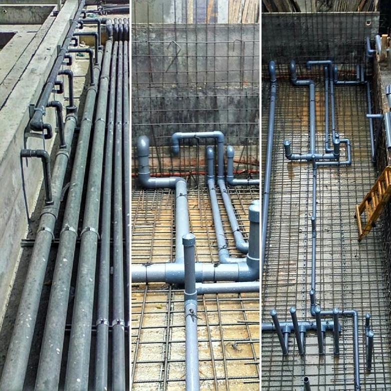 אחד המרכיבים הקריטיים ביותר בבריכת השחייה הינו מערך הצנרת בין בריכת השחייה לחדר המכונות. ברוב המוחלט של המקרים אנו מעדיפים להמנע כליל ממעבר צנרת באדמה ולהצמיד את מבנה חדר המכונות למבנה בריכת השחייה. אולם במקרים בהם אין בריכה – מעבר הצנרת באדמה מחייב יכולת התמודדות עם תזוזות ושקיעות קרקע כאשר גמישות היא מילת המפתח. ביצוע הצנרת הנ"ל ע"י צנרת פוליאתילן ו\או התקנת מחברים גמישים במעבר בין מבנה בטון לקרקע. בתמונות ניתן לראות מערכי צנרת בתוך מבני הבטון של שלד בריכת השחייה וצנרת מקשרת בקרקע שביצענו לאחרונה.