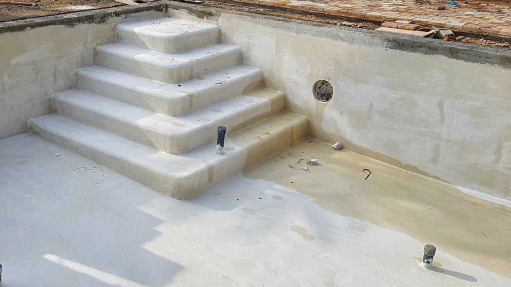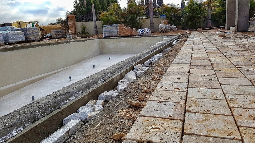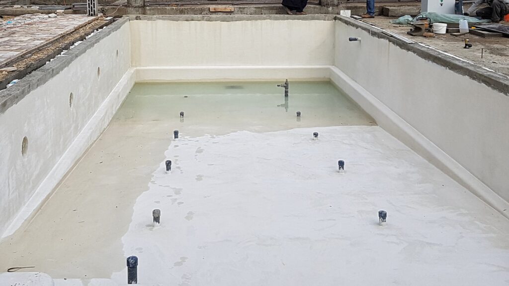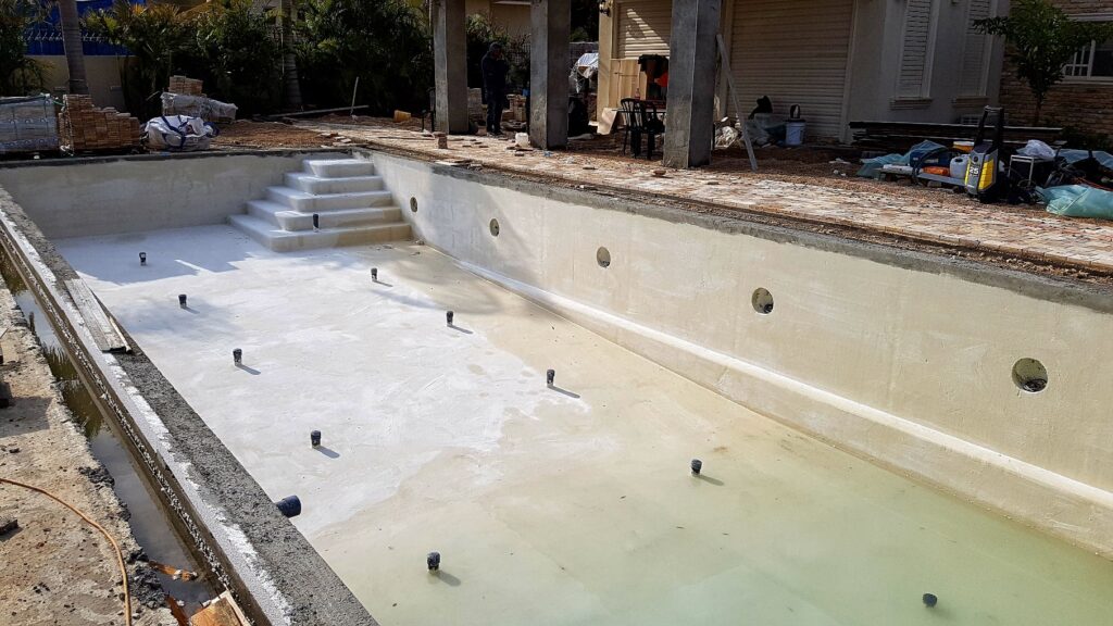 כשמגיעים לשלב איטום בריכת השחייה – הבריכה כבר נראית כמעט גמורה, במקרה זה השתמשנו בממברנת איטום של חברת LATICRETE בצבע לבן המיושמת בכמה שכבות על רצפת וקירות בריכת השחיה כולל תעלת הגלישה. השלב הבא – מילוי מים לבדיקת אטימות למשך כשבוע ולאחר מכן ניתן להתחיל ביישום הפסיפס.