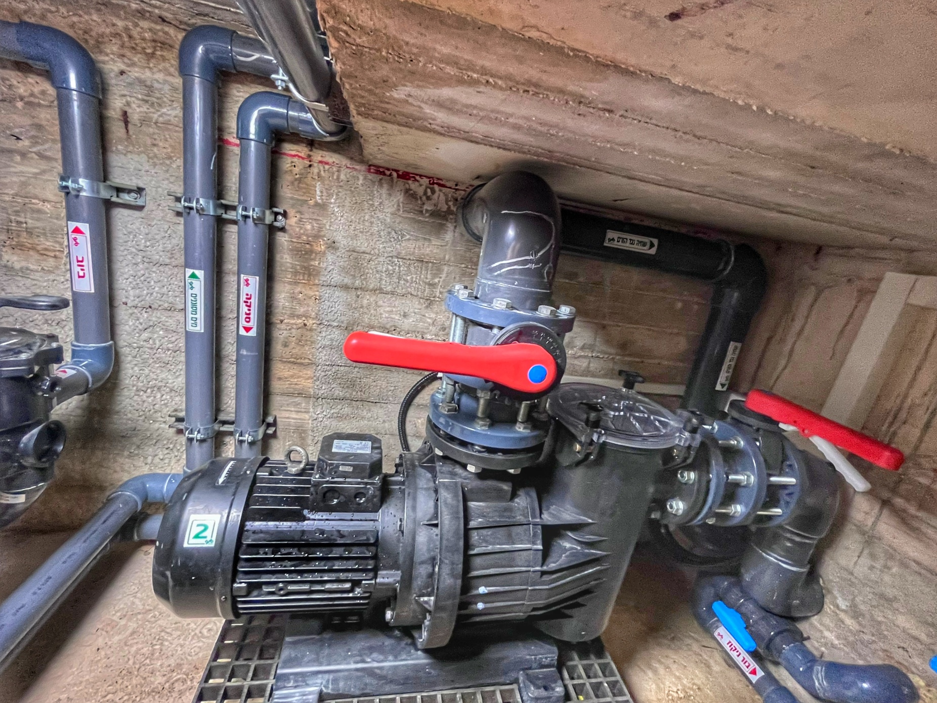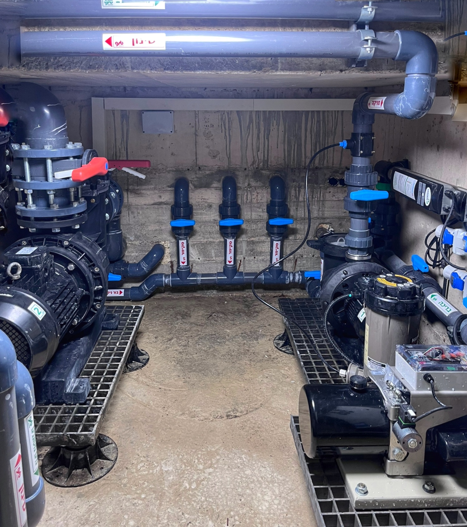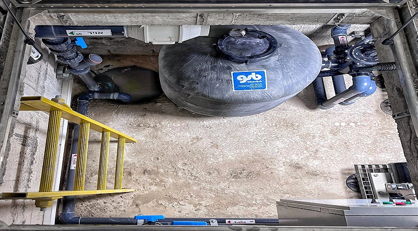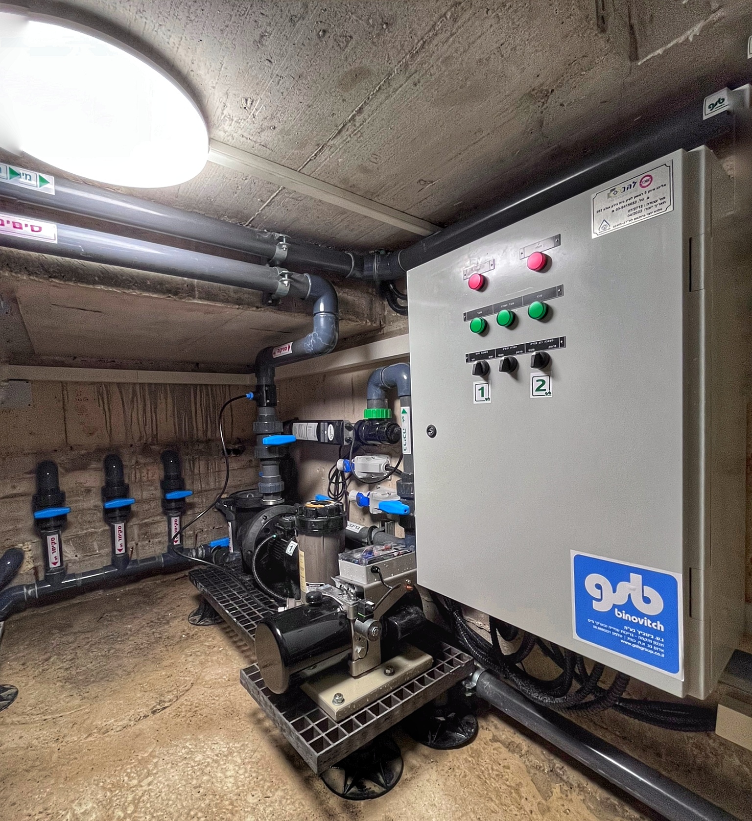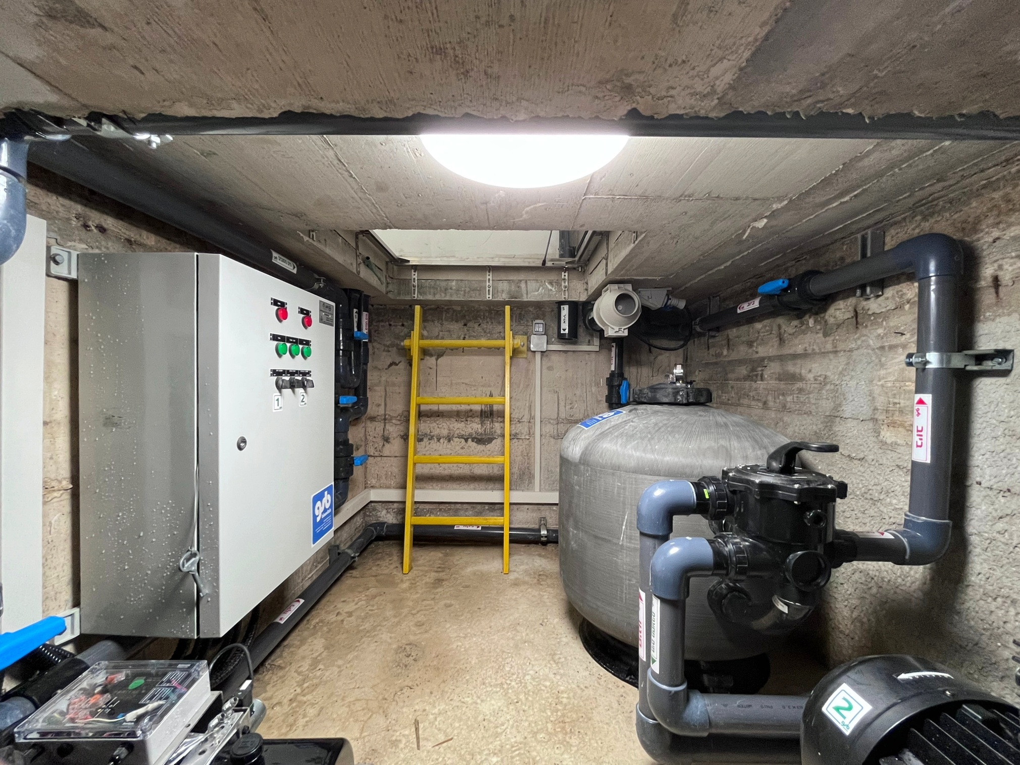 חדר המכונות ממוקם ליד הבריכה ומתחת למפלס המים וכולל מסנן זכוכית מוגדל, מערכת UV לחיטוי ופירוק כלור קשור – נטרול ריחות כלור. מערכת טיהור מי בריכת השחייה מאפשרת שליטה על כל סקימר בנפרד. בחדר המכונות ממוקם גם המנוע ההידראולי של מנגנון כיסוי בריכת השחייה. על כל המערכת שולט לוח חשמל ובקרה מפוליאסטר מוגן מים.