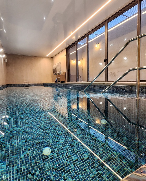 בריכת השחייה תוכננה במרתף הבית מטעמי בטיחות, נוחות וגם פרטיות, בצמוד לחצר אנגלית. חלל מתחם בריכת השחייה מטופל ע"י מערכת לייבוש האוויר למניעת הצטברות לחות.