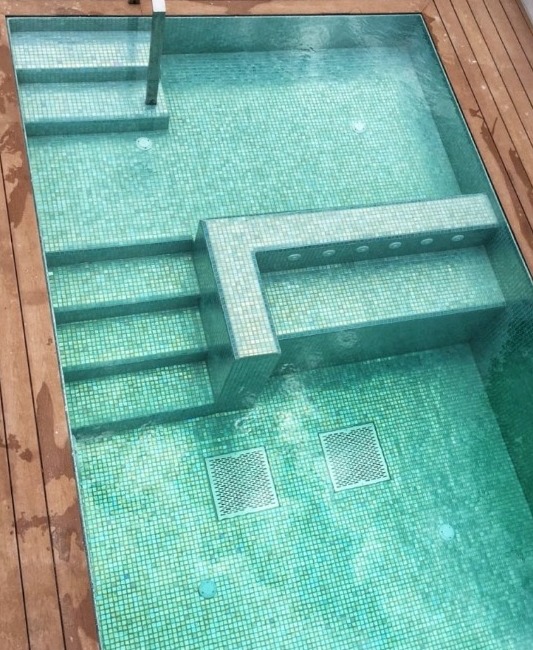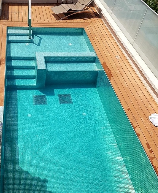 תכנון בריכת השחייה החל כבר בשנת 2014 עם תכנון תוספת 2 קומות על גג בניין לשימור בירושלים. התכנון בוצע עבור נציג המזמין ומשרד האדריכלות הירושלים הוותיק – מייקל שוורץ ושות'. בריכת השחייה תוכננה כחלק ממרפסת הגג וכוללת גם אזור שכשוך לפעוטות. מדרגות המעבר בין מפלסי הבריכה משולבות בספסל עיסוי (ג'קוזי). בקצה השני של בריכת השחייה משולבת מערכת שחייה נגד הזרם רבת עוצמה. בריכת השחייה מחוממת ע"י משאבת חום חסכונית המוצבת על גג הקומה ומכוסה ע"י כיסוי תריס שקוף. מבנה בריכת השחייה מורכב למדי – בחלק מדפנות הבריכה משולבת תעלת גלישה נסתרת ושאר הדפנות מוגבהות מעל פני המים.