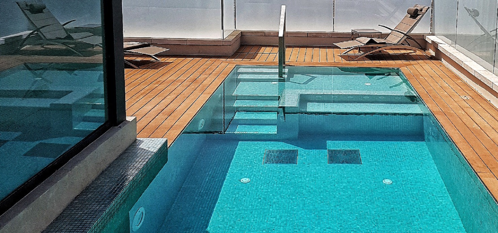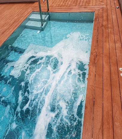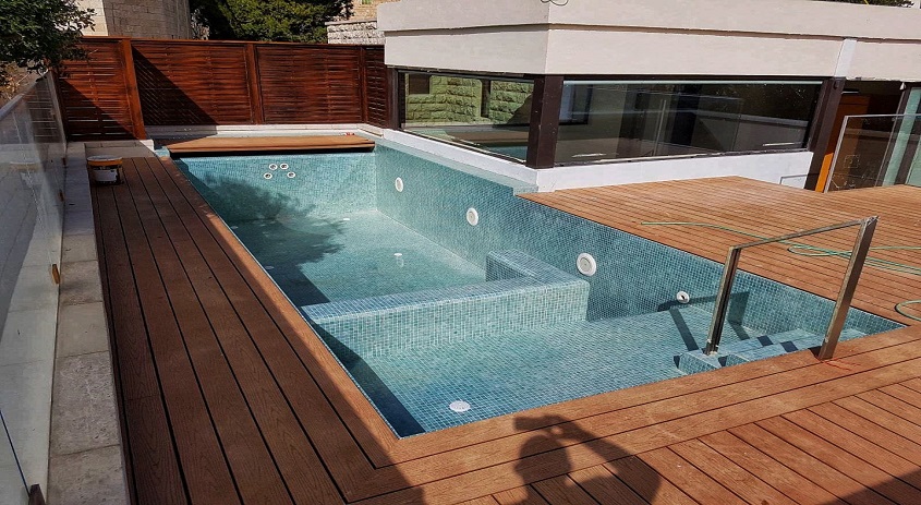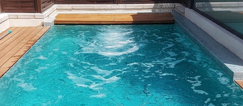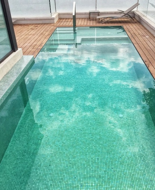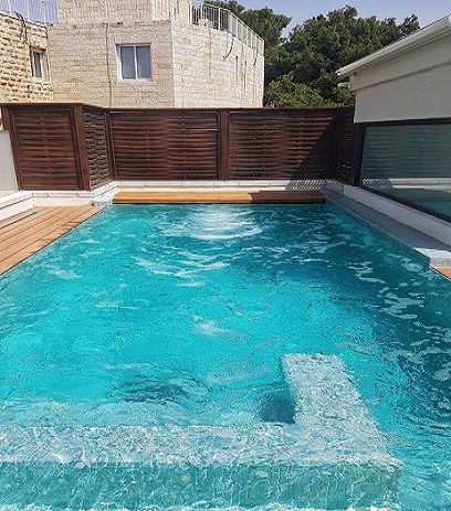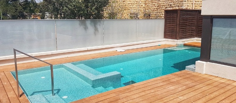 בריכת שחייה – זרמים על גג בניין לשימור בירושלים משולבת עם בריכת פעוטות, ג'קוזי ומתקן שחייה נגד הזרם. אדריכלות: מייקל שוורץ אדריכלים. תכנון וביצוע: GSB ENGINEERING