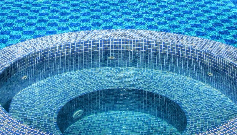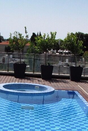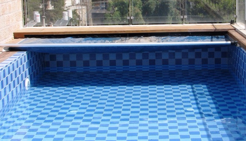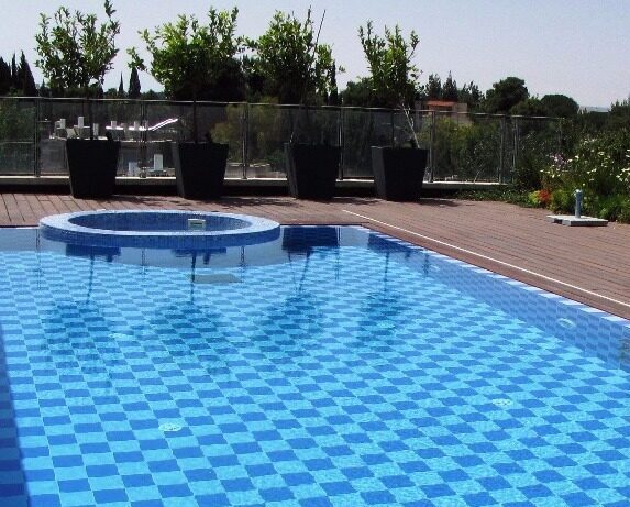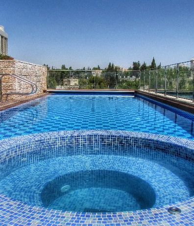 בריכת שחייה על גג בית דירות בירושלים משולבת עם ג'קוזי עגול – בטון בחיפוי קרמיקה ופסיפס.