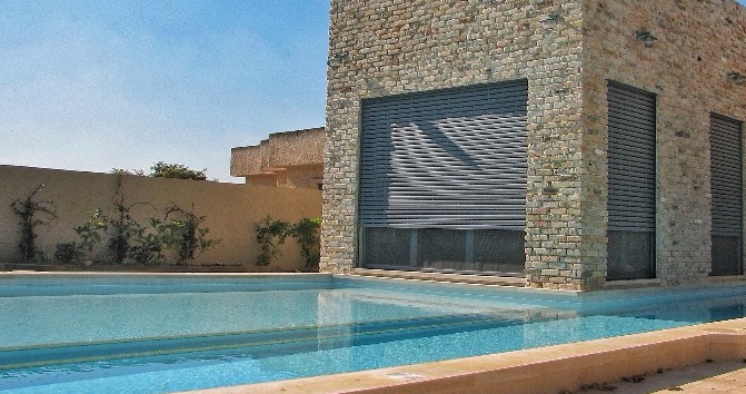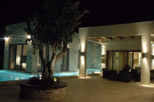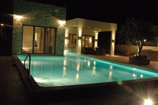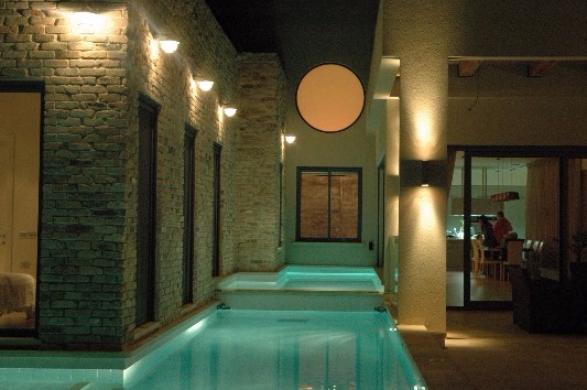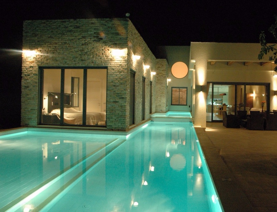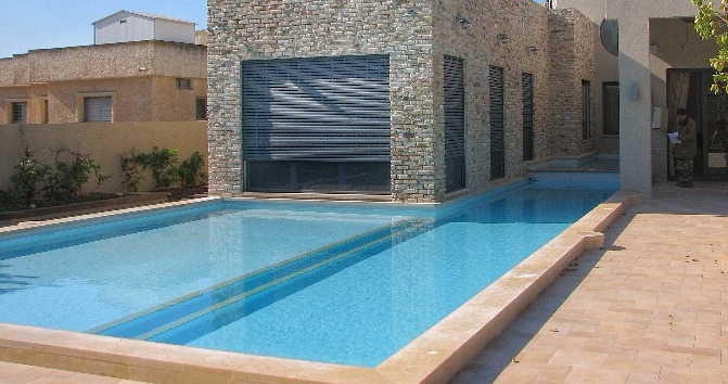 בריכה הבנויה כחלק ממבנה הבית ומשלבת כמה אלמנטים: מסלול שחייה באורך 14 מ', אזור רדוד לנכדים ובריכת נוי בפטיו הגולשת לבריכה הראשית ויוצרת מפל מים. הבריכה עוטפת את חדר השינה הראשי ומגיעה עד לחדר האורחים. צבע הקרמיקה הלבנה נותן למים גוון ירוק- טורקיז טבעי. אדריכלות: אודי גלעדי. מנהל הפרויקט: אייל סביון. קבלן: אייל סביון. תכנון וביצוע: GSB ENGINEERING