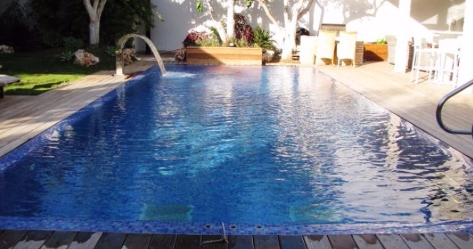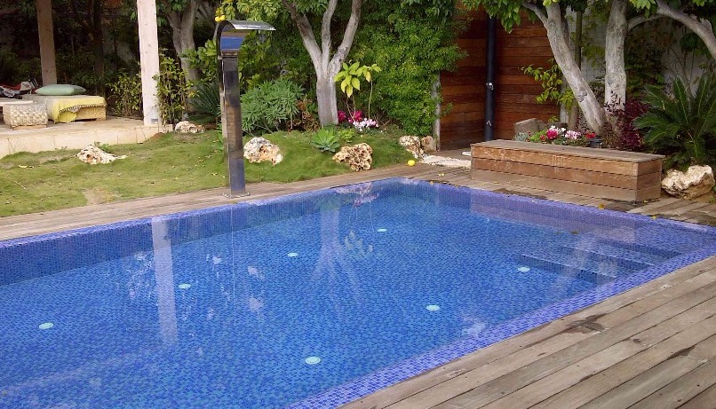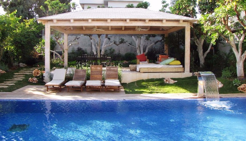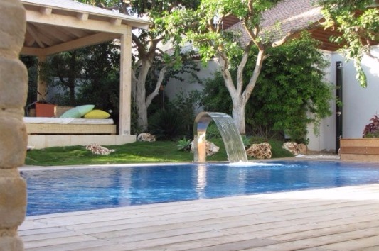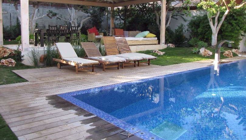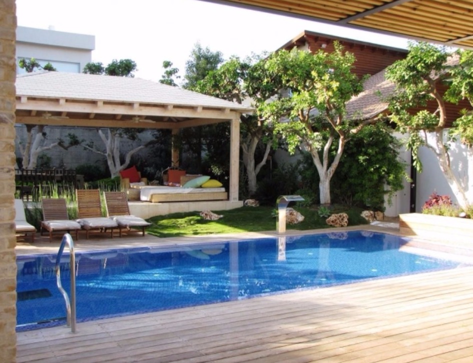 בריכת שחייה בחצר בית בהוד השרון עם תעלת גלישה סמוייה בחיפוי עץ IPEA הכוללת מערכות סינון, חיטוי וחימום ידידותיות לסביבה – חיטוי מי הבריכה מתבצע בעזרת קרינת UV המאפשרת שימוש מינימלי בחומרי חיטוי, חימום מים ע"י מזגן יעיל וחסכוני – משאבת חום. את המערכות הבסיסיות משלימים משפך – מפל מים מנירוסטה ומערכת עצמתית לשחייה נגד הזרם. הפרוייקט כלל תכנון, ניהול וביצוע כולל מעבודות עפר, עבודות בנייה, איטום, חיפוי פסיפס זכוכית, מערכות הבריכה ועד עבודות עץ ודקים. תכנון וביצוע בריכה: GSB ENGINEERING