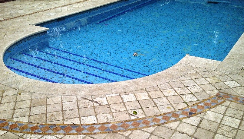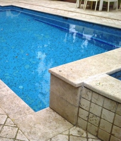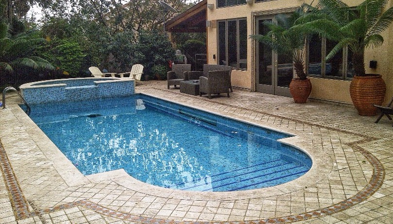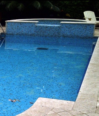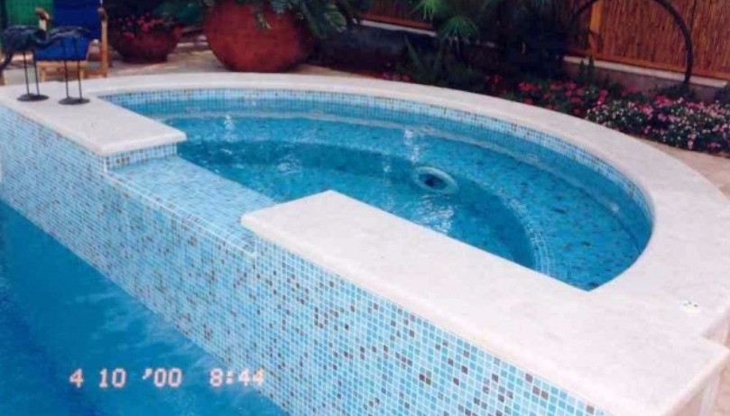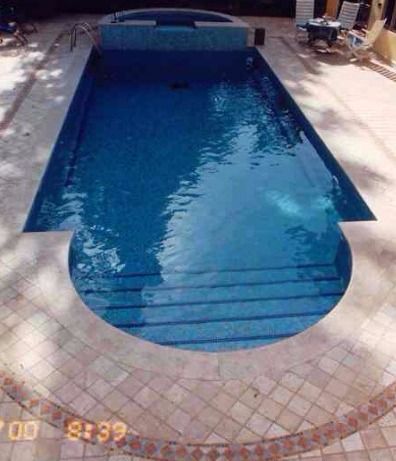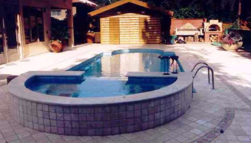 התצורה הקלאסית הרומית תמיד עובדת – בצד אחד מדרגות הכניסה משולבות במבנה הבריכה, בצד השני – בריכת עיסוי (ג'קוזי) הגולש לבריכה. בריכת השחייה עשויה בטון בחיפוי פסיפס עם חלון תת מימי. הבריכה נבנתה בצמוד לבית קיים במסגרת שיפוץ הבית בסוף שנות ה 90, במסגרת הבנייה חפרנו מרתף יינות מתחת לבית הקיים והחלון התת מימי צופה מתוך המרתף ישירות אל מי הבריכה.